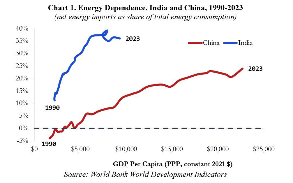 Consider energy imports as a share of total energy consumption for India and China over the course of their recent economic history ( Chart 1 ). Not only is India heavily dependent on imported energy, but its dependency has risen from 10% of energy consumption in 1990 to over 35% in 2023. By contrast, while China has also been quite energy dependent, it has been much less dependent than India at comparable points in its development.