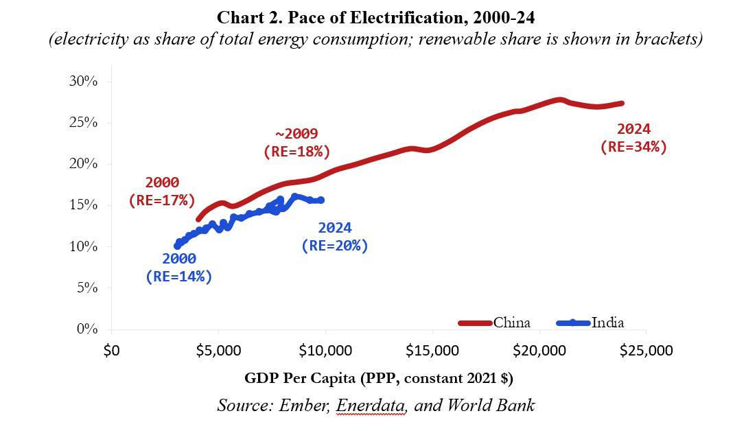 With electricity accounting for 15.6% of total energy consumption ( Chart 2 ), India’s electrification share is below what China’s was at a comparable level of development ( in 2009 ), and well below where China is today ( 27.4% ). Similarly, Chinese renewables as a share of the total are higher, at 35% compared to 20%. India is thus far behind China in its quest for energy independence.